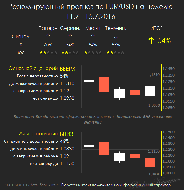 На основании вышеизложенного получен итоговый сигнал вверх до конца недели. 54% за верх. Однако наблюдается конфликт сигналов. Бычьи сигналы паттернов и серийного анализов против медвежьего тенденционного сигнала. Согласно основному сценарию при образовании средней свечи ожидается на неделе рост с закрытием в районе 1.12